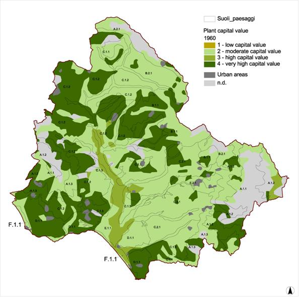 The estimate of soil capital is therefore carried out by intersecting the GIS soil map with the slope gradient map. Only 16% of the study area's surface is characterized by soil capital values that are "high" and "very high", whilst 43% of the surface area falls in the "moderate" class. The value of water capital is moderate (=2) accounting for water scarcity of water in the summer months but also good quality.