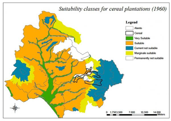 Natural capital: Potential available for change in the Alento area has been assessed by comparing the requirements of specific land uses (cereals, olive, orange and vines) to natural capital components available. Furthermore, for each crop identified the areas where the various crops are cultivated are shown, outlined in black.