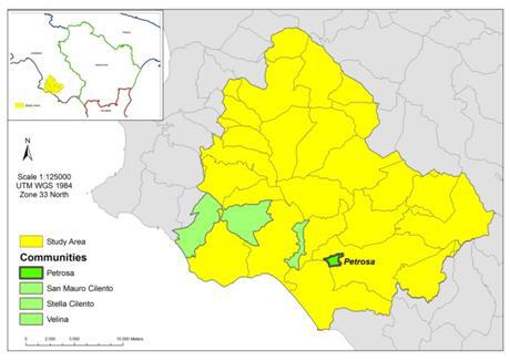 The town of Petrosa is part of the municipality of Ceraso and has a surface area of around 1.36 km², making up around 3% of the municipality (46 km²). It is situated between the rivers Palistro and Badolato, at around 130m a.m.s.l. The town was developed after the reclamation of the area of Fabbrica and the subsequent re-allocation of land of 1891. Since the beginning of the 20th century farming, the social balance of the town was disrupted by successive waves of emigration and the two World Wars. Today Petrosa is largely depopulated as well as isolated due to the poor road network. The majority of farmers work small areas of land, there are few large farms and extensive farming is predominant. One exception to this rule is a local farm of 55ha operating for more than 50 years which has expanded to agro-tourism. |