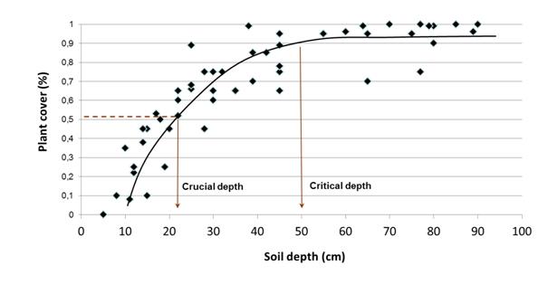| Critical functions | Critical ecological functions are the regulation of hydrological processes and the regional surface energy balance. Both functions are related to soil depth and plant cover. Under the climatic and soil conditions here, below a critical soil depth of 50 cm, plant cover rapidly decreases and consequently surface water runoff significantly increases.