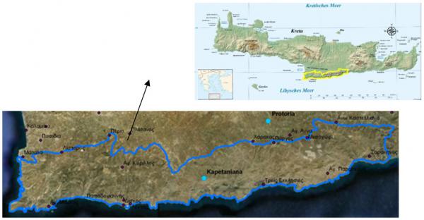 Location The Asteroussia study site consists of the Asteroussia Mountains located in southern Crete, bordered to the north by the Messara valley and to the south by the Libyan Sea, covering an area of 38,428.8 ha. |