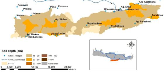 The major soil orders in the area are Leptosols (almost 79% of the area) and Cambisols (almost 21%). Soil is predominantly fine textured (84%) and to a lesser degree medium textured (16%). Soils are highly degraded, with the dominant soil depth class being 15-30 cm (70% of the area) with few patches of deeper soils (class 30-60 cm). Very shallow soils are found especially in the south-facing slopes of the souther part of the mountains. Asteroussia soils have high amounts of rock fragments: 57% of the area falls in the 40-60% rock fragment content class and 43% in the 15-40% class. Soils are very well drained, mainly by small ephemeral channels carrying surface water runoff. Existing channels have high densities due to the impermeability of parent materials.