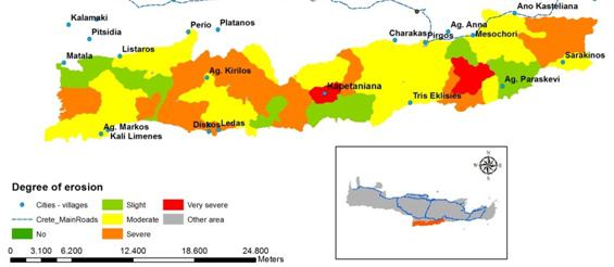 Particular LEDD issues in Asteroussia Natural vegetation in the area is threatened by overgrazing and wild fires, ignited deliberately or accidentally. These occurrences in combination with the steep slopes, render soil erosion a major issue of land degradation and desertification in the Asteroussia Mts. Several parts are severely (32%) or very severely eroded (4%). Slightly eroded areas cover 17% of the area and moderately eroded soils 47%. |