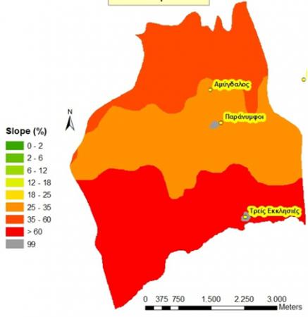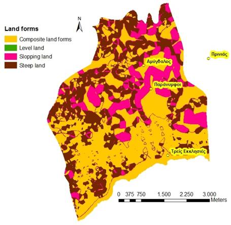 The area is characterised by steep slopes and gorges. Dominant elevation class is 400-600 m (34%), followed by classes 0-200m (12%) and 200-400m (10%). 12% of the area rises over 800 m. Dominant types of landforms are composite landforms (49%) and steep land found mainly in the north-western part of the community (31%). Sloping land covers 20% of the area, mainly found in the central-eastern part of the Paranymfi community. The south part of the community has slopes exceeding 60% mainly while in the north slope class is mainly 35-60%. Slopes are less steep in the central part of the community.
