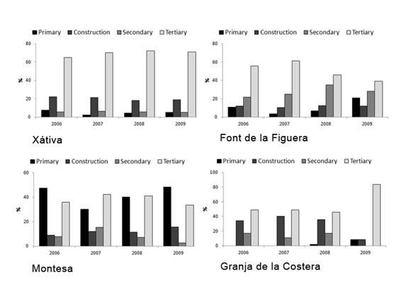 | Assessment | The population is mainly located in areas surrounding the municipality of Xàtiva, and in the municipality of Almansa, a change of around 20%. The population are attracted by the tertiary and construction sectors. Population density ranges between 28.6 inhab. Km-² and over 100.000 inhab. Km-². |