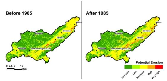 Responses in the Cànyoles watershed after the implementation of the CAP are primarily negative: problems of land degradation are increasing. Modernization and intensification processes clearly aimed at maximizing agricultural production have caused new forms of exploitation that have exceeded the carrying capacity of the territory, depleting and polluting natural resources, such as soil and water. The advent of democracy and the adoption of the CAP policies included some landscape protection. However, these policies have also caused the expansion of highly intensive farming in marginal areas. Abandoned crops cause high soil erosion rates during the first years of land abandonment but these rates decline as vegetation recovers. The decline of the rural lifestyle causes negative effects on the environment. The abandonment of pastures and disappearance of small farms because of their inability to compete in the market, cause changes in land use, provoking landscape transformation.