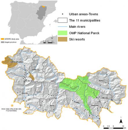 Location The Central Pyrenees study area is located in the Pyrenees mountain ranges, in the north-east of Spain, bordering France. It includes 11 municipalities, 6 of them in Sobrarbe region (Torla, Broto, Fanlo, Puertolas, Tella-Sin and Bielsa), in Ordesa and Monte Perdido National Park and surrounding peripheral zone of protection. Of the remaining 5, 3 (Sallent de Gallego, Panticosa and Hoz de Jaca) are directly affected by ski resorts and the other 2 (Biescas and Yesero) by the ski business. Out of total of 90 villages in the study area, 27 villages have no permanent inhabitants or are abandoned. |