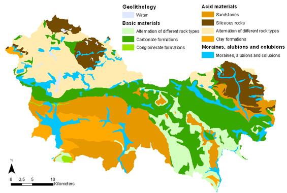 Soils are generally Entisol and Inceptisol. Acid materials dominate more than half of the study area. Quaternary deposits exhibit very low erosion resistance and plutonic rocks (granite and quartzite) the highest. Clay formations and marls also have lower erosion resistance than limestone and sandstone.