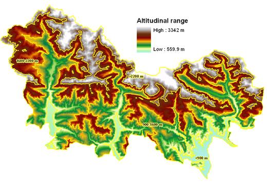 The study area is mountainous with 20% of its surface above 2,200 m and 35% between 1,600-2,200 m. Valley bottoms are at an elevation between 550-900 m (5.3% of the area). The 45% of the area has SE-S-SW orientation and the 31% is oriented to the NE-N-NW. Slopes are generally up to moderately steep (<30°; 60% of the study area), steep (30-50°; 37% of the area) and very steep (3.5% of the area).