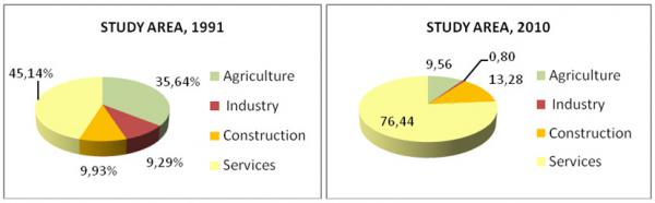 The economic structure of the area largely follows the population dynamic. Among study area municipalities, Fanlo with lower population density has the lowest GDP per capita (10,000-12,000€) and Sallent de Gallego, with the highest population density, has an income well above the average of study area and Aragon (> 20,000€).