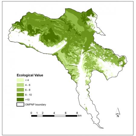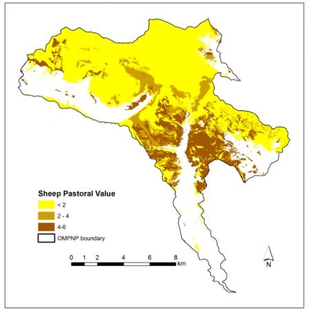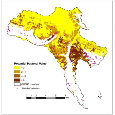 The ecological and pastoral value of grasslands communities are significantly negatively correlated. Areas with a higher ecological value, mainly associated to the higher altitudes and rocky soils, have lower pastoral value (lower biomass and nutritive value) than the more rich communities of the lower altitudes. The grassland communities of OMPNP have an ecological value ranging between 0 and 11, which is higher in the upper parts than in lower parts, attributable to rarity and endemism.