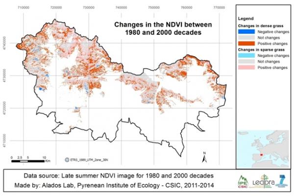 Important socio-economic changes in the Central Pyrenees are related to the abandonment of villages, decline in livestock and human pressure, and consequently the transformation of grasslands into shrublands and forest. The forest already present in 1980 are preserved, but more than 13,000 ha of shrub is transformed into forest. Also, more than 7,000 ha of forest or shrub become grasslands. The most important LEDD problem affecting vegetation cover changes is shrub encroachment in the dense and sparse grasslands. Woody encroachment affects primarily dense grassland (close to 20%) and sparse grassland (less than 10%).