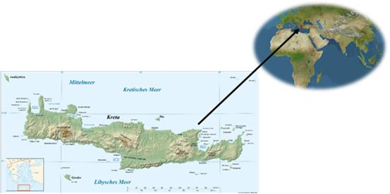 The climate of Crete is sub-humid Mediterranean with humid and relatively cold winters, dry and warm summers. However, climate characteristics show great vertical and horizontal spatial variability: distribution of rainfall during the year is highly irregular as is variation of the air temperature. The potential evapotranspiration (ETo) from 948mm to 1640 mm yr-¹.