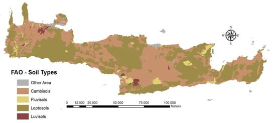 Soils of Crete are generally stony with various contents of rock fragments, a parameter that can have a great but variable effect on soil water conservation and soil erosion, and are characterized as very well drained. Soils are characterized by a variety parent materials such as limestone, shale, marl, conglomerates, flysch and alluvial deposits. Many soils are shallow or subsoil exhibit characteristics adversely affecting biomass production such as bedrock. These characteristics combined with the island’s predominantly steep terrain, contribute to considerable soil erosion problems.