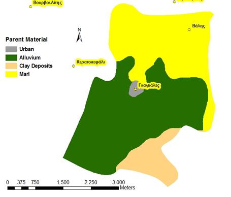 Geology and soils Surface geological materials are mainly alluvial (52.9%) and marl (36.2%) deposits. The latter are located in the upper hilly areas. In the southern part of the area, clay deposits form the uppermost geological formation, covering 9.9% of the total area. The whole area’s soils fall under the Cambisols category. Soil textural class is moderately fine, characterized by low to moderate soil hydraulic conductivity, moderate to high water holding capacity, and moderate risk to ground water pollution by chemicals. Soils tend to be moderately deep (42.4%), deep (46.7%) and very deep (9.9%), containing amounts of rock fragment of up to 40% in the soil surface. Soils are well drained. |