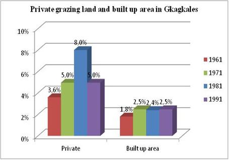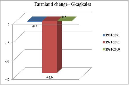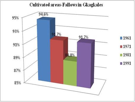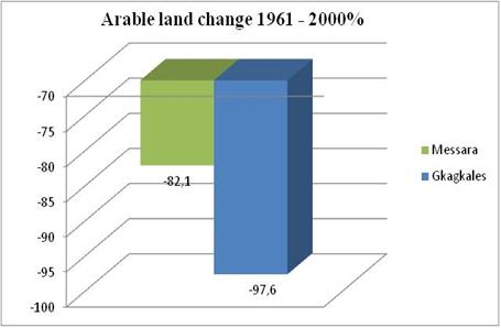 92% of the area is covered by olive groves which have in the last three decades replaced all arable cultivations. The percentage of private grazing lands ranges between 5 and 8% and built up areas have increased from 1.5% in 1961 to 2.5% in 1991. |
