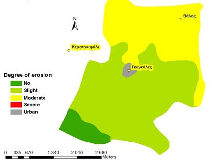 Soil erosion poses a significant threat for Gagales and in particular those sloping areas intensively cultivated with olives. The most important erosion driver is conservation of soil water and clearing the land for collecting olive fruits, whereby farmers leave the land partially bare of vegetation. In addition, due to the presence of marls soils exhibit low hydraulic conductivity and generate high surface water runoff during the wet period. Slightly eroded soils cover 56.6% of the area, primarily in its lower part, while moderately eroded soils cover 36.2% of the area. Biophysically erosion results in lower amounts of water stored into the soil, high soil surface crusting and lower organic matter in the soil surface. Its socio-economic impacts include higher olive oil cost production, higher labour and energy consumption. Because, the land is intensively cultivated in the Protoria community by applying fertilizers, pesticides and herbicides, and water for irrigation. Under such conditions, the existing aquifer of Messara Valley is subjected to chemical deterioration due to leaching of the applied chemicals such as nitrates. In addition, surface water runoff can remove fertilizers enriching surface waters. The whole area is characterized as subjected to moderate risk to nitrate pollution of waters. The main impacts of chemical deterioration of water resources in the community can have negative environmental and social impacts such as: reduction in water availability for human consumption,eutrophication of surface waters, reduction of tourists arriving in the area and production of low quality of agricultural products. |