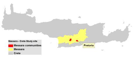 Protoria is located in the lowland of the south-eastern part of the Messara valley. The area is subject to occasional flooding by the local stream and is protected by the Platanias dam. The total area of the study community is 779.5 ha. Annual rainfall is estimated at between 750 and 1000 mm while annual air temperature ranges is in the 15-18°C class.