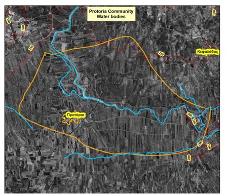 Hydrology Water bodies in the Protoria comprise of two water channels, both tributaries of Anapodaris River. The main water sources for irrigation are groundwater and the Plakiotissa reservoir (18,600,000 m³ capactity). |