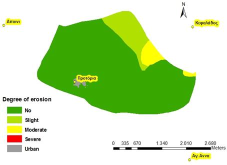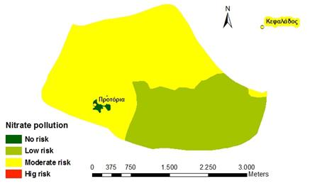 The land is intensively cultivated by applying fertilizers, pesticides and herbicides, and water for irrigation. Under such conditions, the existing aquifer is subjected to chemical deterioration due to leaching of the applied chemicals such as nitrates. The Protoria community area is characterized mainly by moderate potential risk for nitrate pollution of ground water. Areas of moderate risk to nitrate pollution are estimated in 61.6% of the total study area. The rest of the area (37.6%) is characterized as subjected to low risk to nitrate. Chemical deterioration of water resources in the Protoria community does have negative environmental and social impacts including reduction in water availability for human consumption and eutrophication of surface waters. |