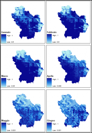Monthly estimate of soil moisture in Basilicata Region (Source: Nolè et al., 2008) |