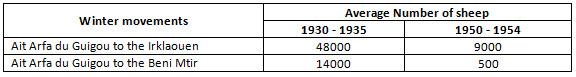 There is a lack of members of Ait Arfa Guigou in Azarhar, compared to other tribes of the Bbeni M’Guild confederation. The Ait Arfa Guigou are stationed on the plateau of the Middle Atlas on both sides of Timahdit. They are therefore obliged to make agreements with adjacent tribes about where they spend winter and allow other tribes to spend the summer in the Ait Arfa Guigou high altitude grazing lands. During 1930-1935, the Ait Ahcine Ben Yakoub of Ait Guigou du Guigou send on average 48,000 sheep to Irklaouen on the plateau of Ito in the Azarhar.