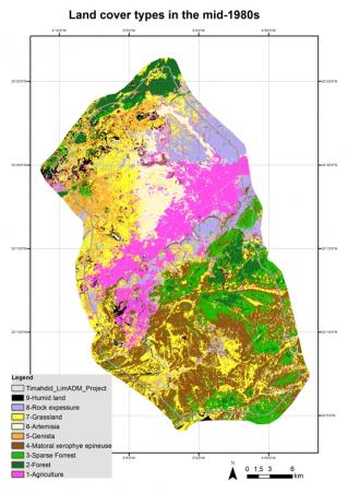 | Assessment | Nine land cover formations can be distinguished including three different types of matoral with different pastoral value (Genista, xerophyt espinouse, Artemisia). Impact of grazing on these matorral is different according to its pastoral value. During the 1980s, land cover is dominated by matorral which coveres 36% of the area of Timahdit. Forest covers almost 16%. Grasslands (the last step in the vegetation succession before bare ground) represents almost 21%, while bare ground averages almost 11%.