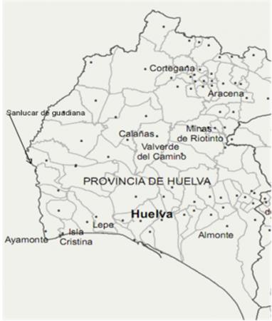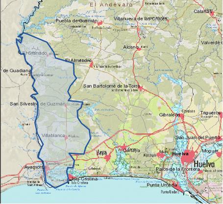 The Western Andévalo study area covers an area of 47.500 hectares in the south-western part of the Huelva province, Andalusía, Spain. The area includes 5 municipalities with approximately 25.000 inhabitants. The biggest municipality both in size and population is Ayamonte. Ayamonte is the coastal town situated at the estuary of the river Guadiana. The study area borders with Portugal on the west and with the province of Seville to the East. To the north lies the Extremadura, and to the south is the Gulf of Cadiz along the the Atlantic coast.