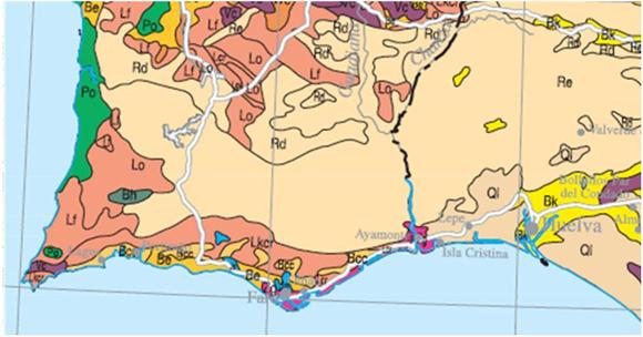 Geologically, the largest part of the study area is of carboniferous origin, consisting of shale, slates and greywacke of fluvial origin. A smaller part in the municipality Sanlϊcar de Guadiana is also carboniferous material, but of volcanic origin namely, Tuff, lavas, acid breccias and quartz. The south of the study area, near the coast, presents younger formations deriving from the Quaternary, consisting of conglomerates, gravel and red clay.