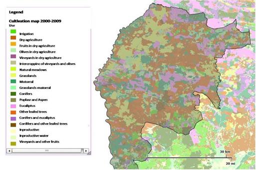 Agricultural land use in Western Andévalo includes a variety of types of cultivation. Until 1982, a trend of farm consolidation was evident, followed by a dramatic reduction (approx. 10,000 hectares) in cultivated land between 1982 and 1989.