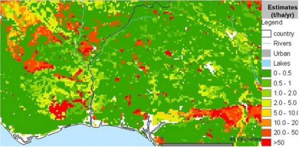 Soil erosion varies within the area, from 0-0.5 t/ha/yr to more than 50 t/ha/y. Orange plantations are particularly susceptible to erosive processes, as trees stand on bare soil on undulating slopes, with very little or no undergrowth. Evidence of rill erosion, such as gullies between planted mounts, are common, particularly at older plantations. New, rapidly expanding citrus orchards tend to ignore natural patterns of relief in the landscape and have very high degrees of soil erodibility. Typical land conversion to this type of citrus orchard includes parallel mount-depression-mount patterns, compaction by heavy machinery, complete vegetation removal and long periods in which the area is left bare before planting starts. This processes is increasing due to ongoing support and financing from regional and EU authorities of supported for the Garcνa-Carriσn processing plant in Western Andévalo, with a capacity of processing 200 million kilos of oranges per year and packing 120 million litres of fresh orange juice. To reach its maximum capacity the plant needs the raw materials from 8,000 ha of citrus groves and is presently supporting the conversion of a further 3,450 hectares of land into orange groves.