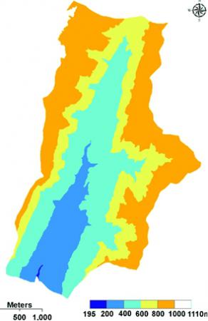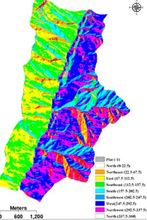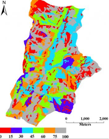 Parent materials of this area are mostly Cretaceous or Tertiary purple shale, sandy shale and sandstone, containing large quantities of iron and manganese oxides. The terrain of the watershed is mainly hilly, with a lowest elevation of 195 m and the highest elevation of 1110 m ASL. Slope gradient ranges from 2° to 58° with an average of 23°. The area’s altitude is between 400-1000m (86%). The most common aspect is west, covering (23%), followed by south-east (15%) and Two main soil great groups occur in the Wangjiaqiao small watershed, namely, purple soil derived from purple sandy shale, and paddy soil developed from the purple soil. |