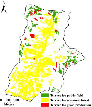 Terraces have been built in an area of 617.72 ha, corresponding to 92.56 ha for paddy field, 497.39 ha for economic forest and 27.77 ha for grain production. The drainage network is used to drainage the rain water runoff.