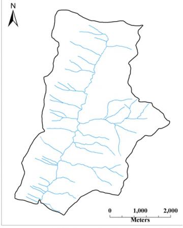 Streams in the Wangjiaqiao watershed have a pinnate drainage pattern, and the length of the main channel is about 6.500 m. Surface water runoff is greater in the summer (114 mm), and lower in spring (49 mm), autumn (46 mm) and winter (10 mm). Most sediment yield is contributed in the summer with a total load of 6527 t, followed by spring and autumn with loads of 1104 and 334 t, respectively. Total runoff generated by rainfall varies between 0.22 and 84.88 mm, with a mean value of 16.45 mm. Peak discharge oscillates between 0.16 and 87.9 m³/s-¹. Base flow level fluctuates from 0.01 to 0.58 m³/s-¹.