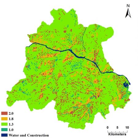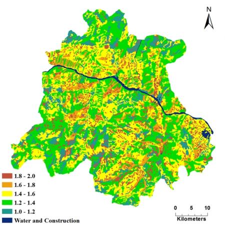 Erosion protection index is about 1.3 (78 %. of the area). The drought resistance index is between 1.0 and 1.2 for more than 70% of the study site, while plant cover index shows greater variability.