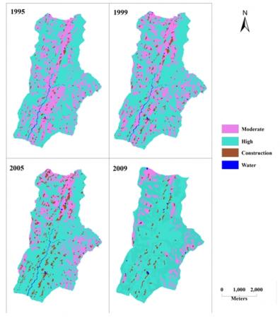 Natural characteristics of the area and its climate (high mountains, steep slopes, broken terrain, uneven temporal distribution of rainfall) contribute to high erosion risk, as do inappropriate land management practices (lack of water conservation, deforestation particularly in steep slopes, down slope cultivation, mining, road and factory construction). In 1950, the forested area in Zigui County covered 40% of the area, whereas in the 60s, 70s and 80s forested area cover 34.8%, 25.9% and 21% respectively.
