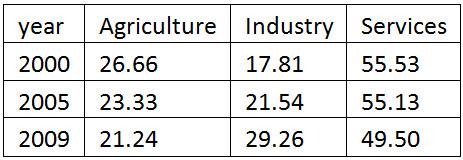 | Assessment | The contribution of agriculture and services to the economy (GDP) decreases while that of industry rises sharply. Canned food and silicon remain the main export goods. Nevertheless, agriculture remains the main source of employment (67%) followed by services (20%) and then industry (13%).
