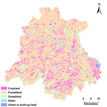The following 7 major ecosystems have been identified in the Zigui County: (a) forest (20% of total area), (b) shrub/grass (13%), (c) urban (7%), (d) agricultural (28%), (e) orange orchard (20% of the total area), (f) bare land (2.5%), and (g) water (10% of the area) (Figure 6.9).