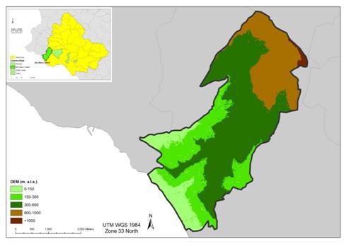 With regard to soil texture, soils are generally moderately fine (36.7%), coarse medium (35.8%) or fine textured (23.9%). Soil depth classes are moderately shallow (30-60 cm, 35.8% of the area), moderately deep (60-100 cm, 34.8% of the area) or deep (100-150 cm, 27.5% of the area). The class of rock fragments between 20% and 40% covers 72.5% of the total area. The area is covered by well drained soils (72.5% of the area).