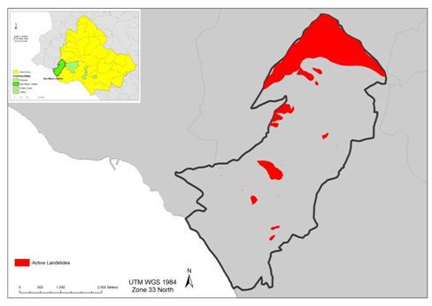 There are 25 examples of active landslides in the area, covering 14% of the territory.