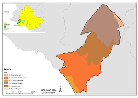 Most frequent soil categories are Calcari-Leptic Cambisols and Endoleptic Luvisol which make up around 35% of the territory. Both types have a much higher percentage in San Mauro Cilento than in the study area as a whole. The category CalcaricRegosols makes up around 33% of the whole study area but is barely present in San Mauro Cilento.
