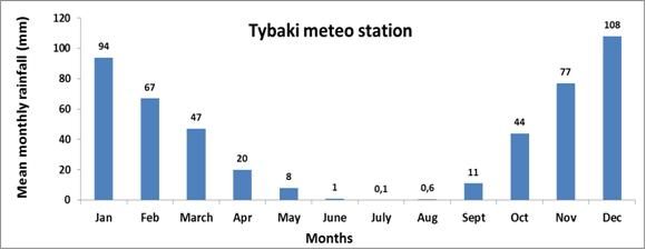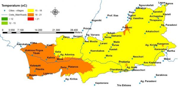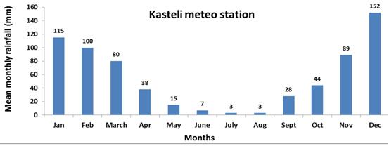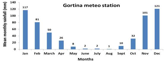 Messara valley is characterised by dry sub-humid climate with mild moist winters and dry hot summers. Average annual rainfall ranges from 750 to 1000 mm. Potential evapotranspiration in the Valley ranges from 1481 mm to 1549 mm yr-¹. The eastern part of the valley has the lowest ETo values. |