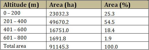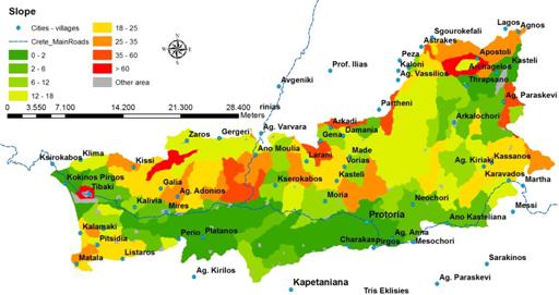 Altitude in the Messara valley is lower than 400m and a large part (39%) is characterised as almost flat. Major types of landforms are composite landforms (36.4%), level land (39.5%) and sloping land (22.4%). |