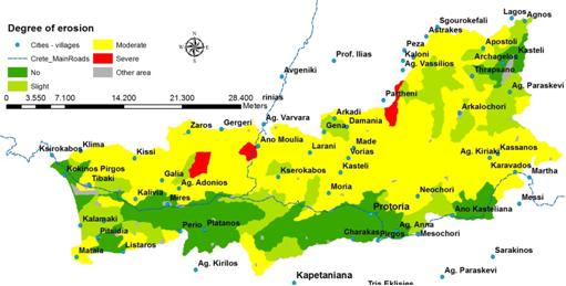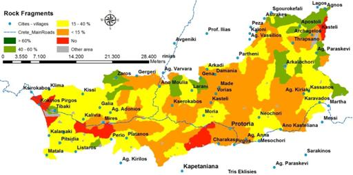 Geologically the valley is characterised by marl deposits (49.6% of the area, mainly cultivated with olives) and alluvial deposits (23.3%) which are the most productive soils intensively cultivated with olives, vegetables, and citrus. Due to the low rainfall in the area the soils are well/moderately well drained. The soils formed on residual parent materials classified mainly as Cambisols (76.4% of the total area) are characterized by their advanced degree of erosion. The agricultural potential of these soils present limitations due to sloping terrain, shallow to moderate soil depth, moderate fertility and excessive drought during the dry season.