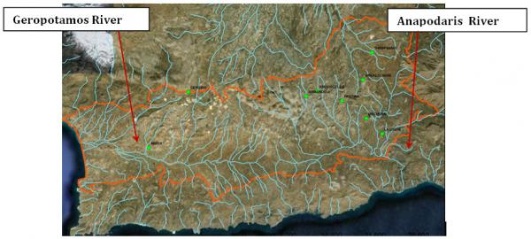 Based on the hydrological boundaries and land use, the valley comprises of two main catchments: the western Messara catchment area (the Geropotamos River discharging near Phaestos) and the eastern Messara catchment area (the Anapodaris River discharging near Demati area). Water flow in Geropotamos is estimated at 14 million m³ per year and the river remains almost dry during the summer period. Anapodaris is the longest river in Crete, discharging about 40 million m³ per year. The main source of irrigation water in Messara Valley is groundwater. Nine main water reservoirs have been identified in the study area, with a total water storage capacity of approximately 25 million m³. The Faneromeni irrigation water reservoir, has a capacity of 19,670,000 m³. |