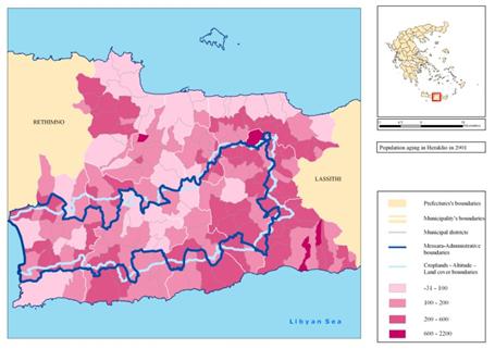 Population ageing in Messara and the communities of Gagales and Protoria is more severe than in the former Heraklion prefecture and Crete in general. |