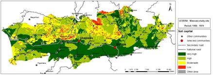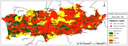 The main water resources are the two aquifers in the bottom valley and some springs located in the valley walls. The total water quantity is estimated to be up to 555 Mm³ and is of high capital value. The dominant classes of vegetation capital are low and moderate, covering 62.0% and 19.8% of the total area, respectively. Such areas are mainly covered with complex cultivation patterns of annual crops (annual and perennials) or complex patterns of annual crops and natural shrubby vegetation. Very high class of vegetation capital covers 16.9% of the total area representing mainly olive groves or vineyards. There is moderate climate capital (88%) during this period, possibly attributed to high aridity. The western part of the valley, along the coast, has lower climate capital due to lower annual rainfall and higher aridity. |