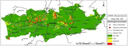 Critical functions | Regulation of hydrological processes (assessed by estimating surface water runoff). Areas of low hydrological regulation processes (infiltration rate lower than 70%) are mainly located in the northern part of the valley with the steepest slopes. The lower part of the Messara Valley has a high or very high ability to regulate hydrological processes (infiltration rate over 85% covering more than 95% of the total area).