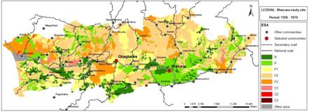 Critical variables | Environmental fast and slow variables are soil depth (slow variable) and land use change (fast variable). Soil depth decreases slightly, mainly in the hilly areas. Expansion of olives at the expense of cereal cultivation is the major land use, expanding from 18.2% of total land area during the late 1950s to more than 38% in 1974. |