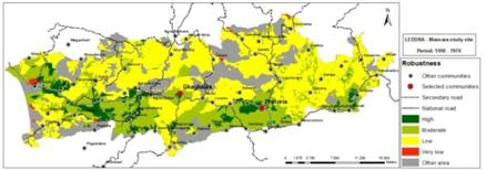 Robustness of natural capital (assessed based on soil characteristics and the vegetation cover type) is generally low: any severe lack of rain water during the growing period results in disappearance of cereals. The lower part of the valley has much higher robustness due to the presence of deep soils cultivated mainly with perennial crops. Diversity of land cover is relatively low. Redundancy is generally moderate: the farming economy is based on a mixture of cropland cultivation (various crops) and husbandry. Cropping systems in the area are moderately connected: cereal production is tightly connected to husbandry and fields with spare olive trees are connected to vine cultivation.